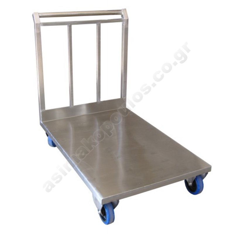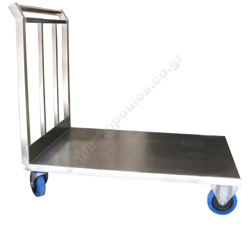 Ανοξείδωτο καρότσι μεταφοράς κιβωτίων με τέσσερις ρόδες ανοξείδωτες, δύο σταθερές και δύο περιστρεφόμενες.