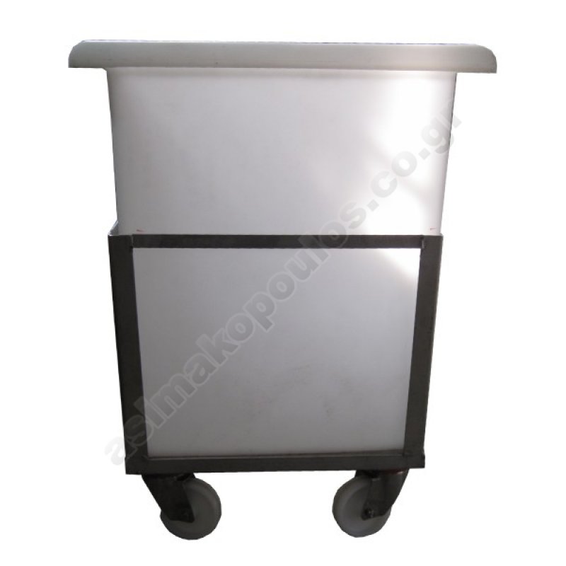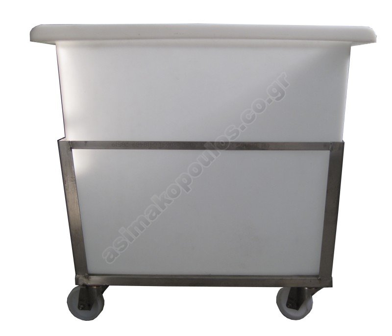 Ανοξείδωτο καρότσι μεταφοράς πλαστικών μπάνιων εξολοκλήρου κατασκευασμένο από ανοξείδωτο χάλυβα AISI 304 με τέσσερις περιστρεφόμενες ανοξείδωτες ρόδες.