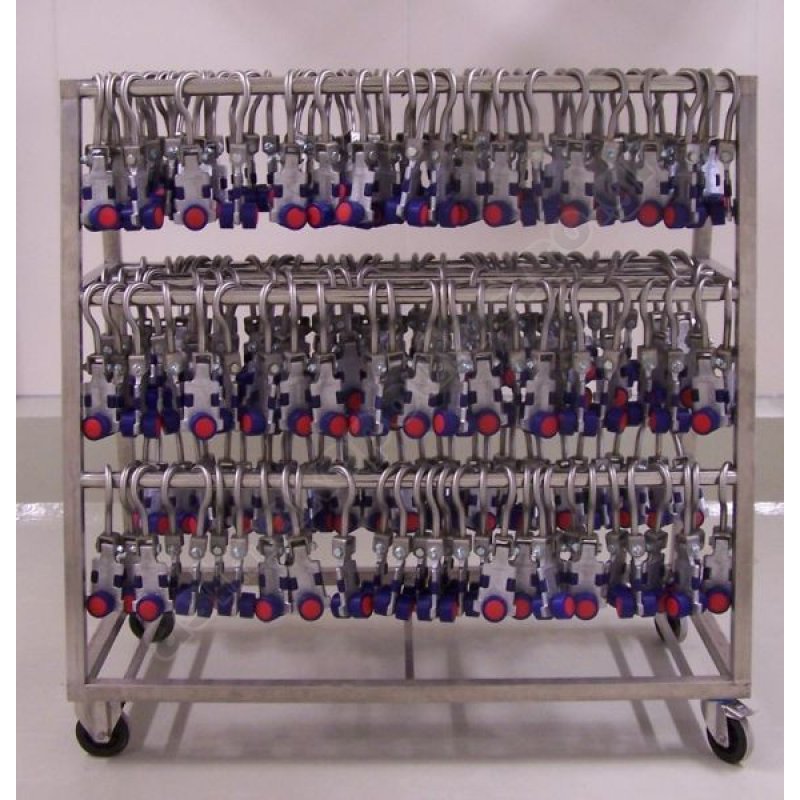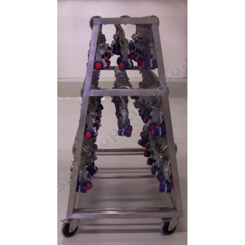 Ανοξείδωτο καρότσι μεταφοράς τσιγκελιών, με τέσσερις ρόδες ανοξείδωτες, δύο σταθερές και δύο περιστρεφόμενες με φρένο.