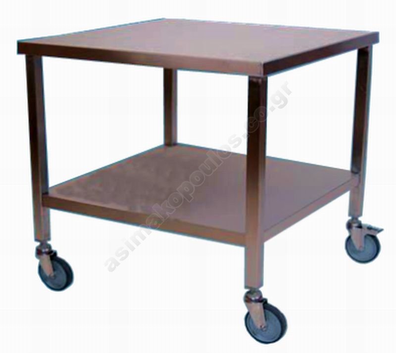 Ανοξείδωτο καρότσι σερβιρίσματος δύο επιπέδων εξολοκλήρου κατασκευασμένο από ανοξείδωτο χάλυβα AISI 304 με τέσσερις ρόδες περιστρεφόμενες, οι δύο με φρένο