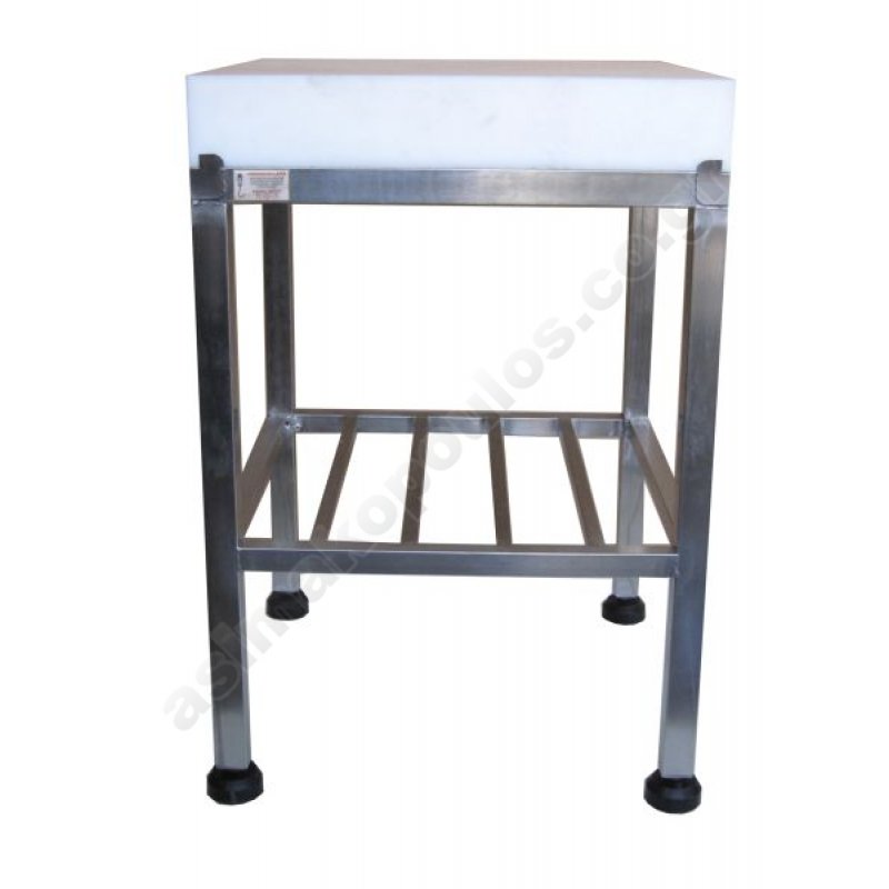 Ανοξείδωτος πάγκος (κούτσουρο) με πολυαιθυλένιο κοπής κρεοπωλείου, ρυθμιζομένου ύψους με αντιολισθητικά πέλματα και πλάκα πολυαιθυλενίου πάχους 50mm - 100mm